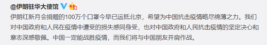 据“伊朗驻华大使馆”微博消息,伊朗红新月会捐赠的100万个口罩今早已运抵北京,希望为中国抗击疫情略尽绵薄之力。我们对中国政府和人民在疫情中遭受的损失感同身受,也对中国政府和人民抗击疫情的坚定决心和意志深感敬佩。中国一定能战胜疫情,而我们将与中国朋友并肩作战。