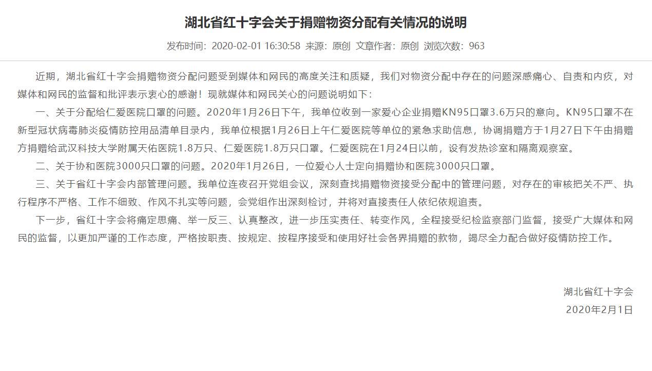 荔枝新闻讯 据湖北省红十字会消息,近期,湖北省红十字会捐赠物资分配问题受到媒体和网民的高度关注和质疑,我们对物资分配中存在的问题深感痛心、自责和内疚,对媒体和网民的监督和批评表示衷心的感谢!现就媒体和网民关心的问题说明如下: