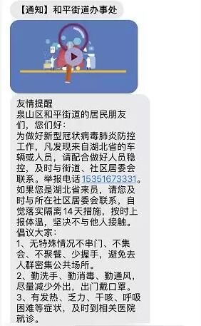 和平街道全覆盖向辖区居民手机短信发布防疫知识和友情提醒,及时公布举报电话,发动居民做好新型冠状病毒感染的肺炎防控工作,并倡议大家无特殊情况不出门,勤洗手、勤消毒,不信谣、不传谣。