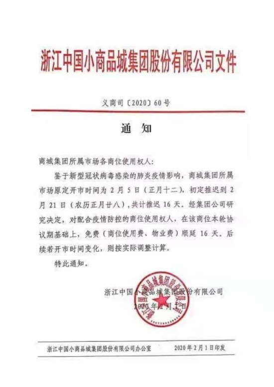 而浙江、上海、广东等地更早时候就发布了各企业延迟至2月9日复工的决定,且不少地方有对商户、对外来人员免租的政策。截稿前,记者又看到,2月1日,浙江中国小商品城集团股份有限公司发布了针对集团所属市场商位使用权人的通知,提到原定开市时间2月5日,初定推迟到2月21日,推迟16天,且推迟期间商位使用费、物业费免费。