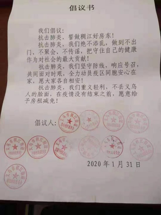 记者还发现,1月31日,有一个非官方的“倡议书”在义乌当地民众的微信圈中流传,其中显示“抗击肺炎,我们重义轻利,不丢义乌人的脸面,在疫情没有结束之前,愿意给予房租减免!”,倡议人是义乌市稠江街道11个村民委员会。该文件附有这些倡议人的红色盖章。