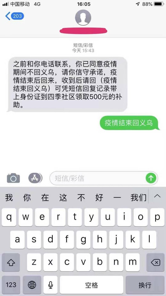 该条短信截图的文字内容显示如下。发信者:之前和你电话联系,你已同意疫情期间不回义乌,请你信守承诺,疫情结束后回来,收到后请回(疫情结束回义乌)可凭短信内回复记录带上身份证到四季社区领取500元的补助。收信者:疫情结束回义乌。