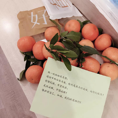 最近,张方园又收到了一份意外的“礼物”。一位武汉市民听说他们是从南京来的,特地送来了水果并赠言:“有你们在,希望就在!武汉必胜!中国必胜!保护好自己,加油!我们的英雄们!”