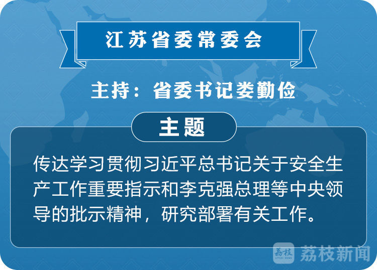 荔枝新闻讯 江苏省委常委会近日召开会议,传达学习贯彻习近平总书记关于安全生产工作重要指示和李克强总理等中央领导的批示精神,研究部署有关工作。