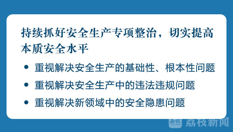 会议指出,要持续抓好安全生产专项整治,切实提高本质安全水平。重视解决安全生产的基础性、根本性问题,下决心全面深入排查解决。重视解决安全生产中的违法违规问题,下决心夯实企业的主体责任。重视解决新领域中的安全隐患问题,坚决杜绝监管盲区。当前,安全生产督查检查要根据疫情防控工作实际,采取灵活举措,在国务院督导组的指导下,聚焦27个行业领域狠抓整改落实,从安全生产的规律出发,切实提高本质安全水平。