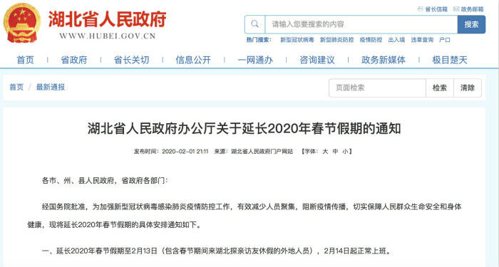 荔枝新闻讯 湖北省人民政府办公厅发布通知,经国务院批准,为加强新型冠状病毒感染肺炎疫情防控工作,延长2020年春节假期至2月13日(包含春节期间来湖北探亲访友休假的外地人员),2月14日起正常上班。