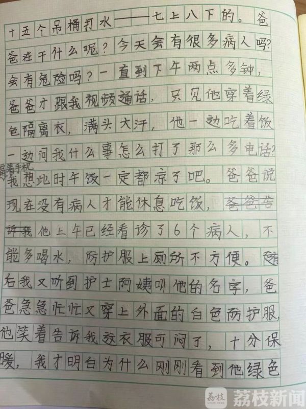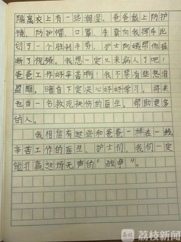 “一直到下午两点多钟,爸爸才跟我视频通话,只见他穿着绿色隔离衣,满头大汗……”殷若诚在日记里写道。看到女儿写的日记,殷军锋也落下热泪。“在上发热门诊前,我的内心也是有些许恐慌的,更何况那些对医学不了解的老百姓。所以我告诉大家,不要紧张、科学防治;坚定信心、同舟共济。相信我们有信心,有能力打赢这场疫情阻击战!”殷军锋说。