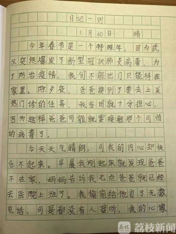 和关颖希一样暖心的,还有普外科医生殷军锋的大女儿殷若诚。殷若诚今年上小学三年级。她在写给爸爸的日记里写道:“除夕夜,爸爸接到了要去上发热门诊的任务,我当时就十分担心,因为这样爸爸可能就要接触那个可怕的病毒了。”