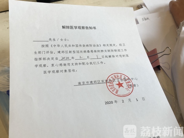 2月1日,疫情防控指挥部门传来消息,航班上两名发热旅客两次病毒检验结果都是阴性,这也意味着酒店隔离的57名旅客可以离开了。下午四点多,57名旅客在签完解除医学观察告知书后,陆续撤离。工作组安排了专门的大巴车送有需要的旅客去南京南站、禄口机场以及溧水。