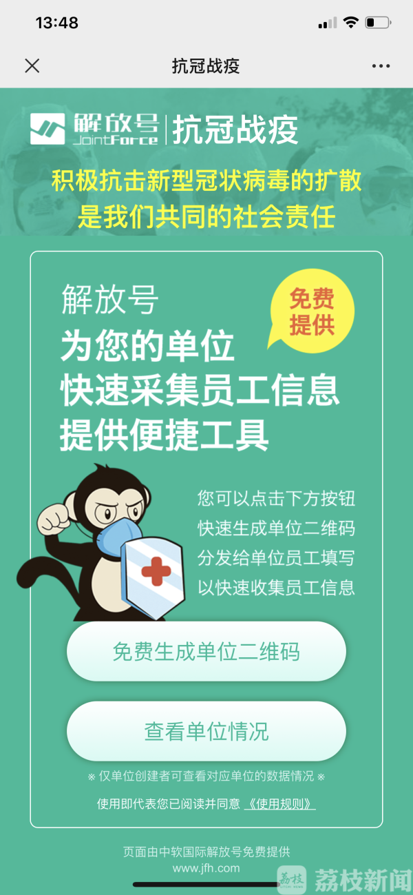 春节假期加班加点,通过紧急设计、开发、调试,首款“神兵计划”微信小程序“抗冠战疫”已正式上线,可以帮助企业快速收集员工健康信息,以解决企业层层收集员工信息的繁琐,将面向所有企业免费开放至疫情结束,目前已有400多家单位在使用。