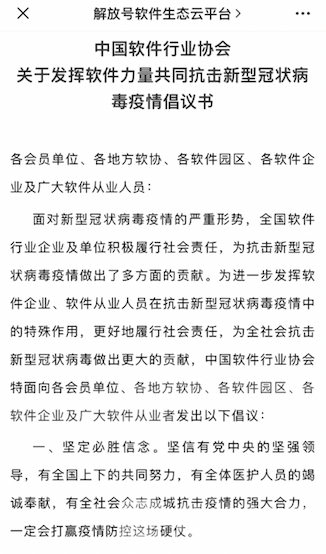 医院防护用品急缺,如何能尽快将物资送到他们手中?怎样发动移动互联网的力量,帮助社会实现“联防联控”?中国最大软件生产平台——总部位于中国(南京)软件谷的中软国际解放号,联合中国软件行业协会,向全国软件企业和人才发出“神兵计划”召集令,呼吁全国“码农”共同加入“战疫”,记者了解到,目前已有 1000 多位“码农”纷纷响应,帮助地方募集物资的“海报神器”小程序已于今天(2月1号)上线,另有近50款软件和应用正在加紧研发中。