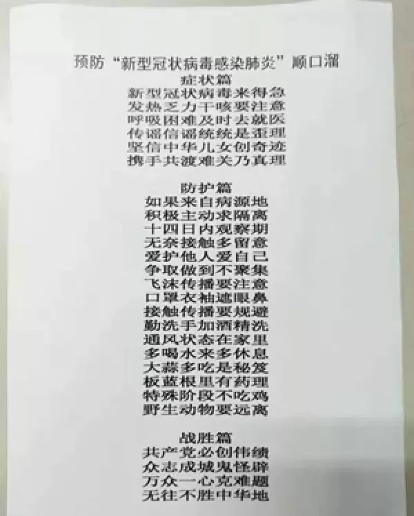 据悉,孙亮他们管辖片区光餐饮单位就有154家,超市、水果店等也有二三十家。除了发挥脚力,一家一家去检查、督促,还得加大宣传力度。于是,孙亮自编一套《预防“新型冠状病毒引发的肺炎”顺口溜》,打印在A4纸上,连外卖小哥也跟着转发学习。