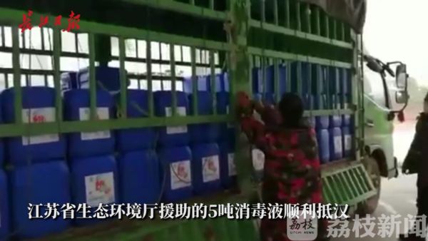 今天(2月2日),江苏省生态环境厅筹集支援的5吨84消毒液,辗转千里,经过南京、鄂州、武汉三地接力,运达武汉。