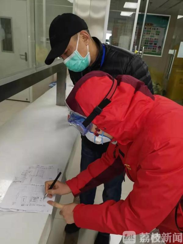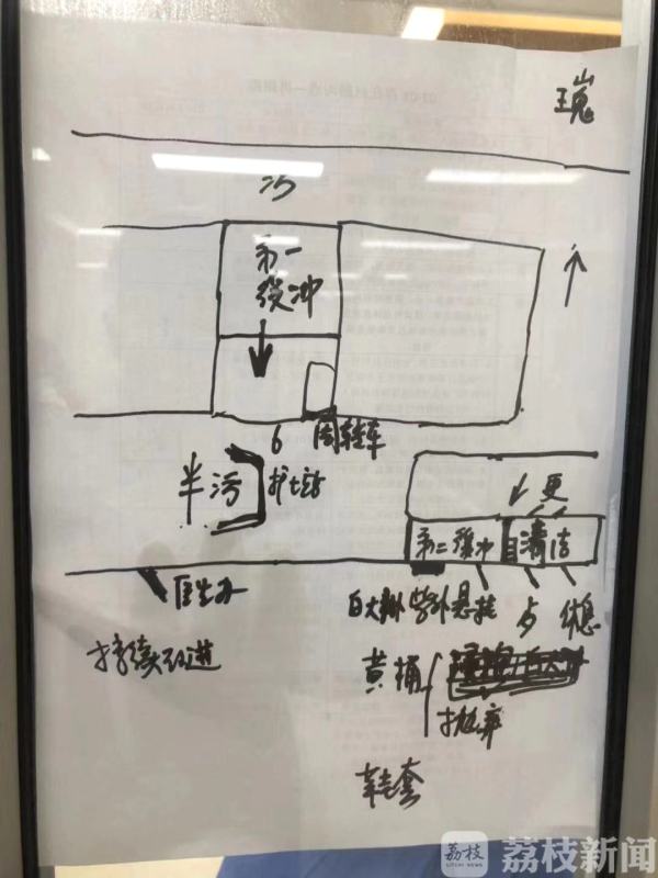 这是江夏区第一人民医院的局部地图,虽然潦草,但是江苏医疗队的每一位成员都熟记于心。为了防止医院不同区域间出现病毒感染,保证患者和医务人员的安全,南医大二附院的孙立群凭借着自己多年的工作经验,实地察看、手绘草图、一遍遍更改,将自己所在的病区做成了感控示范病房。