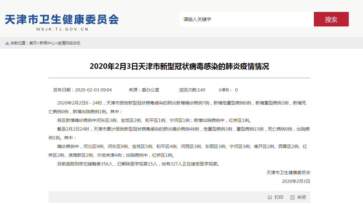 截至2月2日24时,天津市累计报告新型冠状病毒感染的肺炎确诊病例48例,危重型病例3例,重型病例15例,死亡病例0例,出院病例1例。其中: