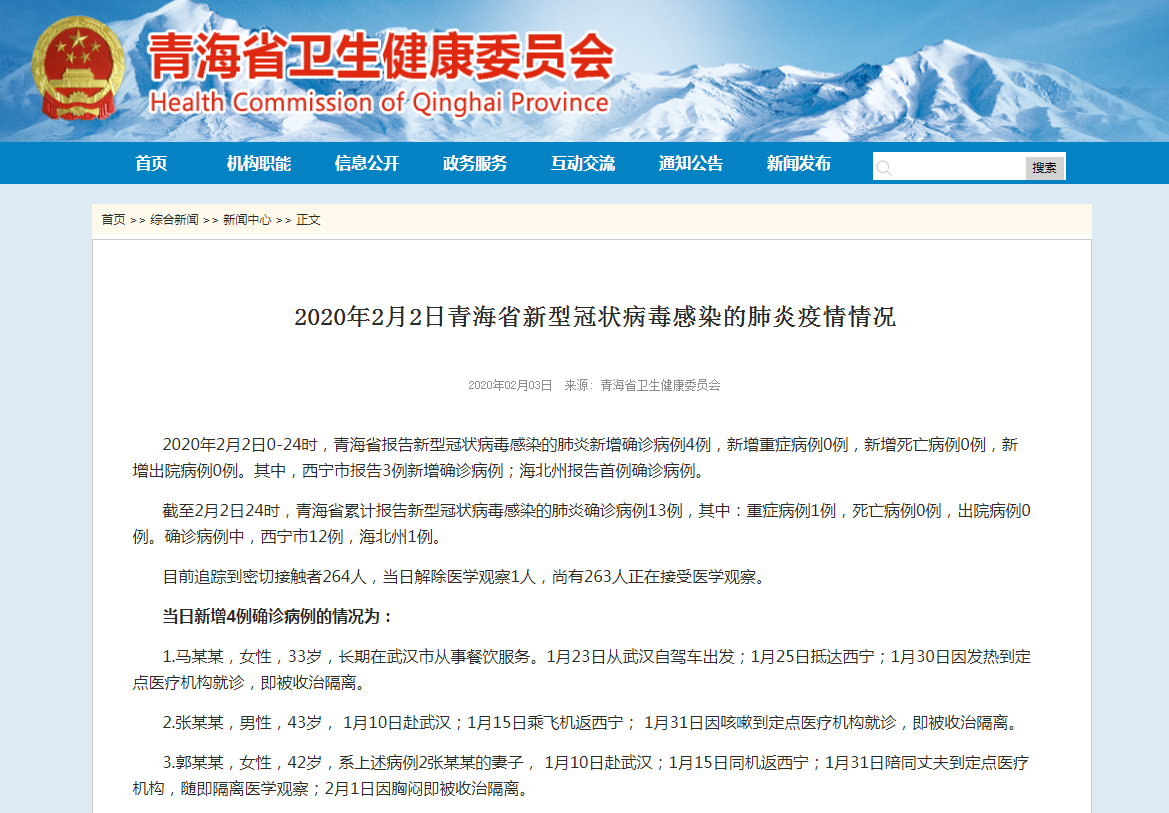 截至2月2日24时,青海省累计报告新型冠状病毒感染的肺炎确诊病例13例,其中:重症病例1例,死亡病例0例,出院病例0例。确诊病例中,西宁市12例,海北州1例。