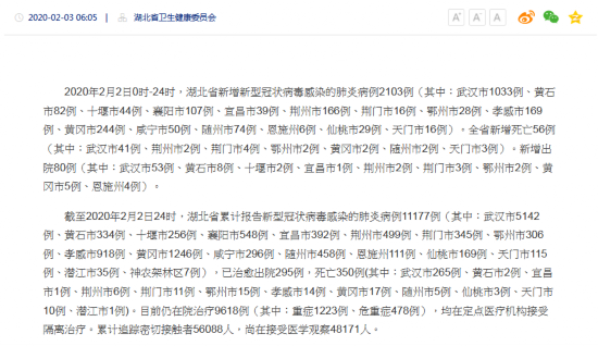 荔枝新闻讯 据湖北省卫健委3日最新发布的疫情数据,2日0时-24时,湖北新增新型冠状病毒感染的肺炎病例2103例,全省新增死亡56例。截至2日24时,湖北省累计报告新型冠状病毒感染的肺炎病例11177例。