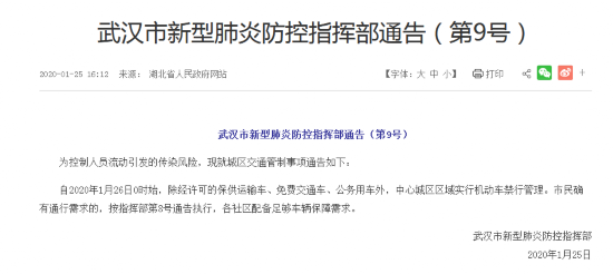 1月25日,为控制人员流动引发的传染风险,武汉市新型肺炎防控指挥部就城区交通管制事项通告: