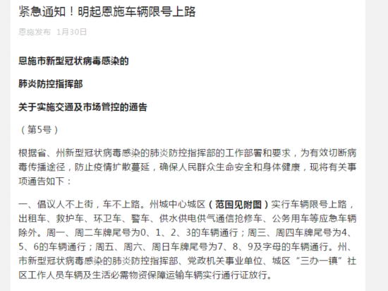 1月30日,恩施新型冠状病毒感染的肺炎防控指挥部关于实施交通及市场管控的通告: