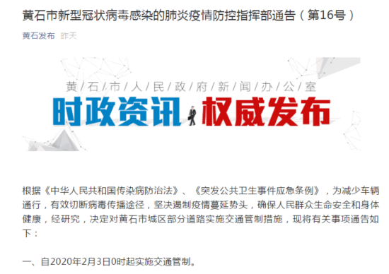 2月2日,黄石市新型冠状病毒感染的肺炎疫情防控指挥部发布通告: