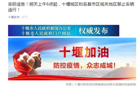自2020年2月3日上午6:00起,在十堰市城区和各县市区城关地区禁止车辆通行,切断病毒传播渠道。除十堰市新型冠状病毒感染的肺炎疫情防控指挥部允许的“六类车辆”“四类人员”驾驶车辆和指挥部临时允许通行的车辆外,其他车辆禁止通行。