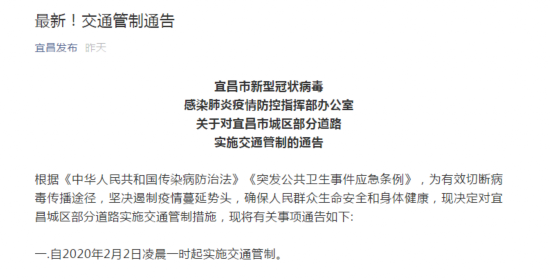 2月2日,宜昌市新型冠状病毒感染肺炎疫情防控指挥部办公室,发布关于对宜昌市城区部分道路实施交通管制的通告: