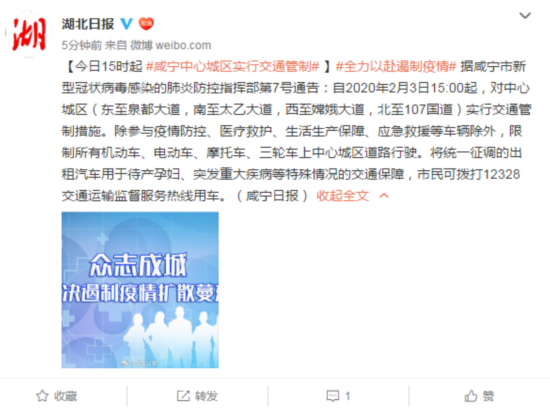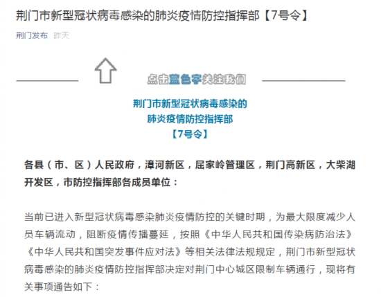 2月2日,荆州市新型冠状病毒感染的肺炎防控指挥部关于市区进一步限制车辆通行的通告:
