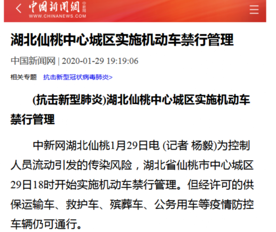 由仙桃市新型冠状病毒感染的肺炎疫情防控指挥部发布的公告称,自1月29日18时起,中心城区除经许可的应急供保运输车、公务车、邮政车、救护车、垃圾清运车、消防车和殡葬车等特种车辆外,其他车辆禁止出行。对未经允许而通行的,由公安交警部门依法处理。