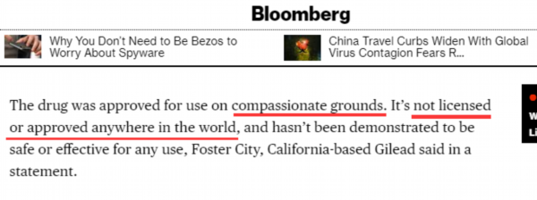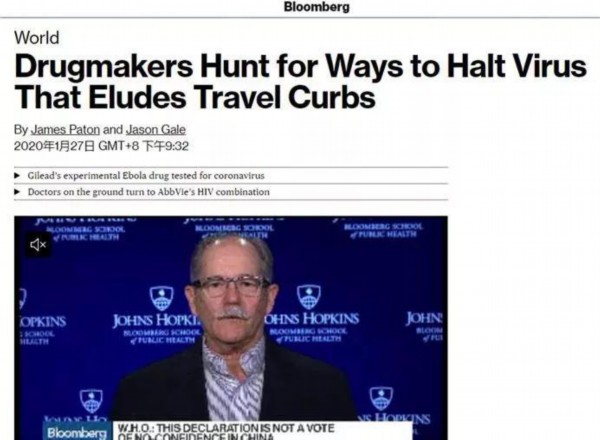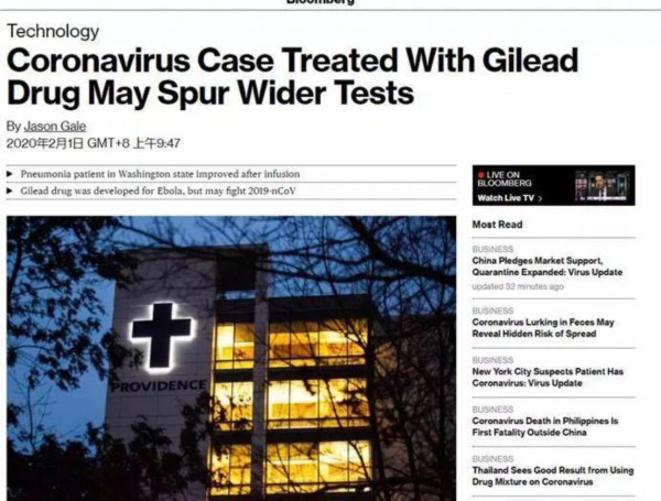 其中,美国“彭博社”在1月27日和2月1日曾刊登过两篇提到美国药企吉利德在与中国方面合作,测试该公司的药物“瑞德西韦”是否对新型冠状病毒有效。这也是截至耿直哥撰文时能从彭博社的网站中找到的唯一两篇与“吉利德”“瑞德西韦”和“中国”这三个关键词有关的报道。