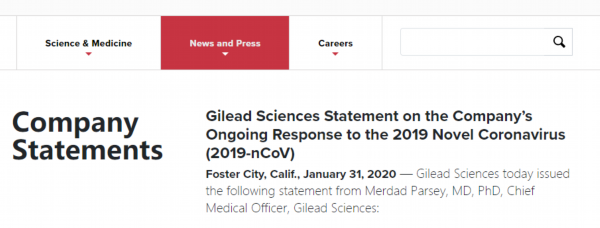 我们还检索了涉事的美国药企吉利德的官网网站,发现这家药企发布了一个关于公司应对新型冠状病毒的声明,可这份声明中同样没有提到任何“美国总统特朗普豁免瑞德西韦对中国的专利”的内容。