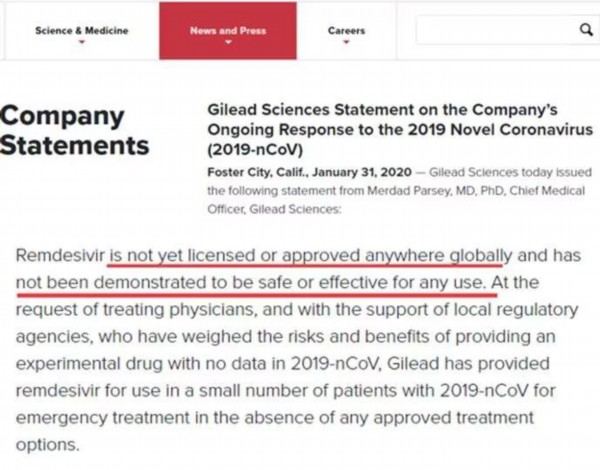 研发“瑞德西韦”的药企吉利德所发布的声明,也是这么一个态度,即他们的这种药物目前尚未在全球任何一个地方上市,也尚未证明能安全有效地对抗病毒。
