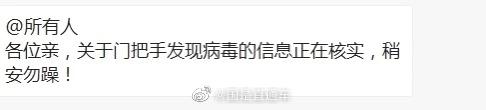 近日,有媒体报道广州市疾控中心在确诊患者家中门把手上发现了新型冠状病毒的核酸。为此,中新社@国是直通车 向广州市卫健委求证,其回应称,关于门把手发现病毒信息正在核实,稍安勿躁!