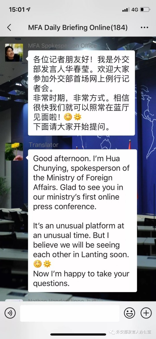 2月3日下午3点,外交部发言人华春莹主持的首场网上例行记者会(MFA Daily Briefing Online)准时上线,200多位中外记者朋友共同参与了这场与众不同的记者会。