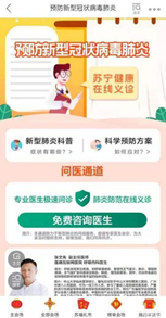 苏宁健康义诊在线服务于每日9时-18时期间提供,三位专业医生将在线坐诊提供专业高效的问询服务,而关于新型冠状病毒肺炎的科普信息、辟谣信息、防护信息等则全天可浏览。通过搜索"求问诊"、"问医"、"冠状病毒"、"冠状肺炎名医免费问诊" 这些词,即可进入到苏宁健康义诊在线服务页面。