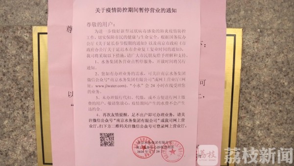 用水方面,目前南京水务集团各实体营业厅暂停开放,抄表员暂停抄表。用户可以登录"南京水务集团有限公司"的微信公众号或者是网上营业厅(网址: www.jlwater.com) 办理缴费等业务。