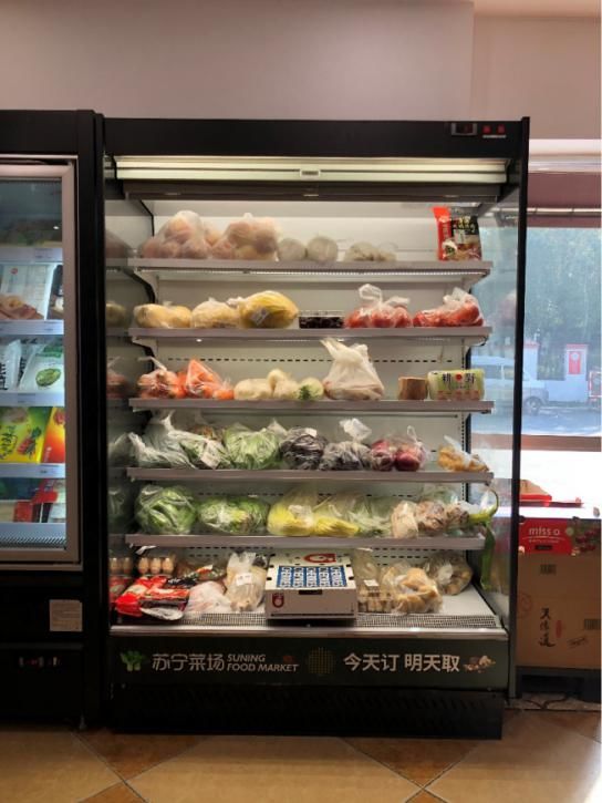 南京市紫金东郡苏宁小店门口一大早就摆满了各式自提生鲜蔬菜,前来自提蔬菜的消费者大多是该小区居民。店内的副店长刘林表示,由于疫情的影响周边很多商铺关店,不少附近小区的居民都选择来苏宁小店补充日常所需。