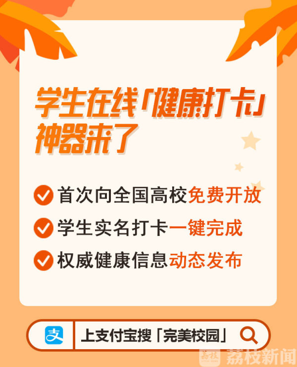 今天(2月3号)起,江苏海洋大学、齐齐哈尔大学、南京大学金陵学院等50多所高校启用 “健康打卡”在线申报系统。上支付宝搜“完美校园“,登陆本人所在高校,即可完成健康情况申报。