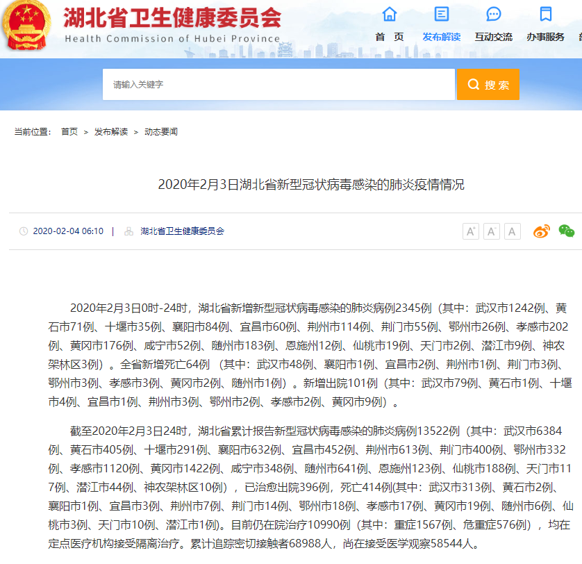截至2020年2月3日24时,湖北省累计报告新型冠状病毒感染的肺炎病例13522例(其中:武汉市6384例、黄石市405例、十堰市291例、襄阳市632例、宜昌市452例、荆州市613例、荆门市400例、鄂州市332例、孝感市1120例、黄冈市1422例、咸宁市348例、随州市641例、恩施州123例、仙桃市188例、天门市117例、潜江市44例、神农架林区10例),已治愈出院396例,死亡414例(其中:武汉市313例、黄石市2例、襄阳市1例、宜昌市3例、荆州市7例、荆门市14例、鄂州市18例、孝感市17例、黄冈市19例、随州市6例、仙桃市3例、天门市10例、潜江市1例)。目前仍在院治疗10990例(其中:重症1567例、危重症576例),均在定点医疗机构接受隔离治疗。累计追踪密切接触者68988人,尚在接受医学观察58544人。