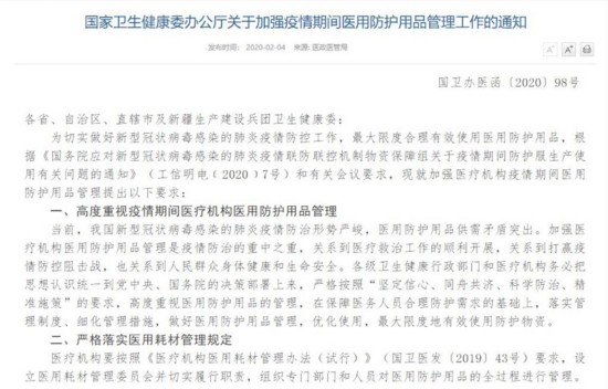 中国网财经2月4日讯 据国家卫健委网站消息,为切实做好新型冠状病毒感染的肺炎疫情防控工作,最大限度合理有效使用医用防护用品,国家卫生健康委办公厅印发了关于加强疫情期间医用防护用品管理工作的通知,就加强医疗机构疫情期间医用防护用品管理提出具体要求。