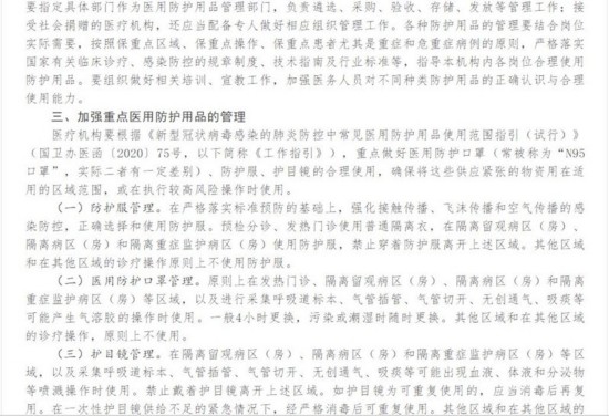 三是加强重点医用防护用品的管理。医疗机构要根据《新型冠状病毒感染的肺炎防控中常见医用防护用品使用范围指引(试行)》(国卫办医函〔2020〕75号,以下简称《工作指引》),重点做好医用防护口罩(常被称为“N95口罩”,实际二者有一定差别)、防护服、护目镜的合理使用,确保将这些供应紧张的物资用在适用的区域范围,或在执行较高风险操作时使用。