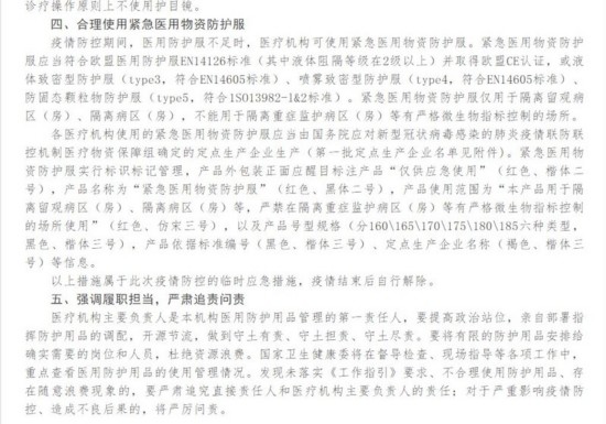 四是合理使用紧急医用物资防护服。疫情防控期间,医用防护服不足时,医疗机构可使用紧急医用物资防护服。紧急医用物资防护服应当符合欧盟医用防护服EN14126标准(其中液体阻隔等级在2级以上)并取得欧盟CE认证,或液体致密型防护服(type3,符合EN14605标准)、喷雾致密型防护服(type4,符合EN14605标准)、防固态颗粒物防护服(type5,符合1SO13982-l&2标准)。紧急医用物资防护服仅用于隔离留观病区(房)、隔离病区(房),不能用于隔离重症监护病区(房)等有严格微生物指标控制的场所。