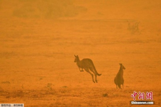 当地时间1月4日,澳大利亚Cooma,两只袋鼠在浓烟弥漫的田野上跳跃。据报道,澳大利亚多地气温预计飙破40摄氏度,加上强风风向改变,将助长和扩散火焰,恐让野火失去控制。