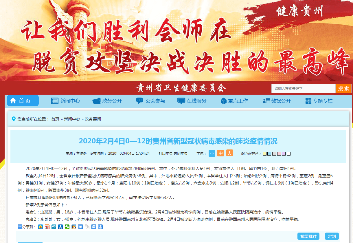 截至2月4日12时,全省累计报告新型冠状病毒感染的肺炎病例58例。其中,外地来黔返黔人员35例,本省常住人口23例;治愈出院2例,病情平稳48例,重症2例,危重症6例;男性31例,女性27例;年龄最大80岁,最小1个月;贵阳市10例(1例已治愈),遵义市9例,六盘水市9例,安顺市2例,毕节市9例,铜仁市6例(1例已治愈),黔东南州4例,黔南州6例,黔西南州3例。现有疑似病例32例。