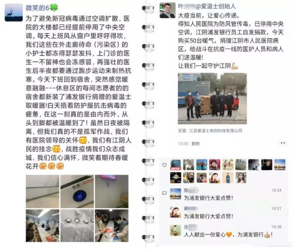 人民医院的医生被浦发银行的善举感动了,他们说,“我们真的不是孤军奋战,我们信心满满,微笑着期待春暖花开”。取暖器生产商也被感动了,表示要让爱心传递、一起守护江阴!