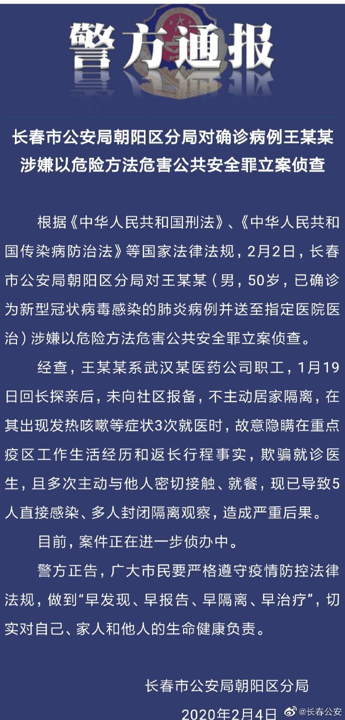 荔枝新闻讯 2月4日晚,长春市公安局发布通报称,根据《中华人民共和国刑法》、《中华人民共和国传染病防治法》等国家法律法规,2月2日,长春市公安局朝阳区分局对王某某(男,50岁,已确诊为新型冠状病毒感染的肺炎病例并送至指定医院医治)涉嫌以危险方法危害公共安全罪立案侦查。