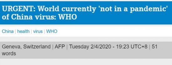 法新社刚刚报道称,世界卫生组织4日表示,新型冠状病毒感染的肺炎目前并非 “全球性流行病”。