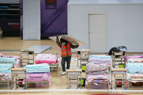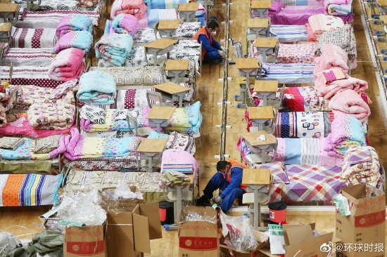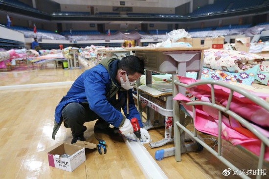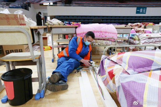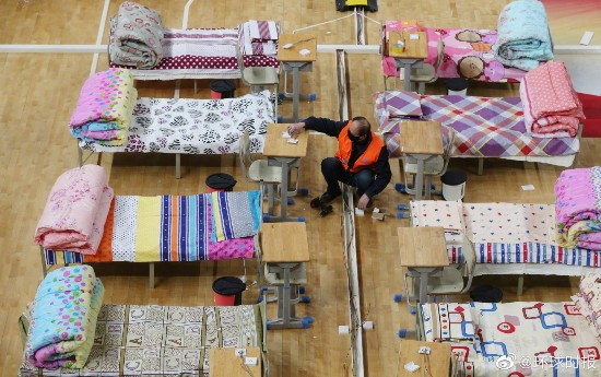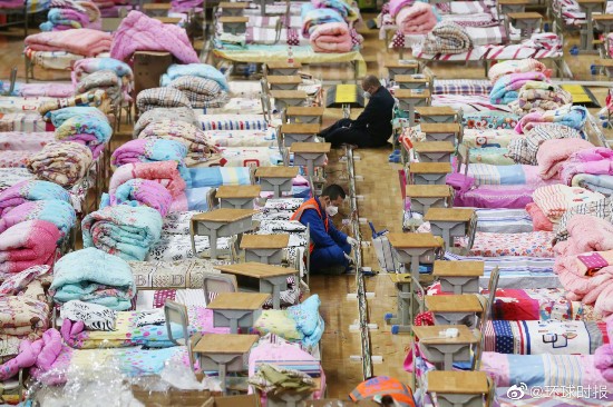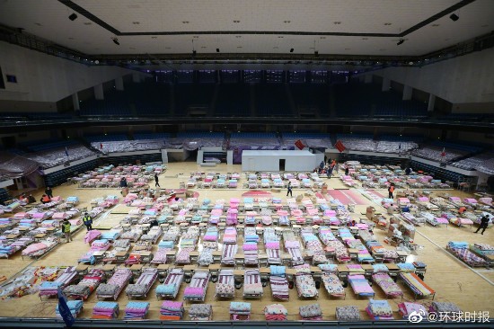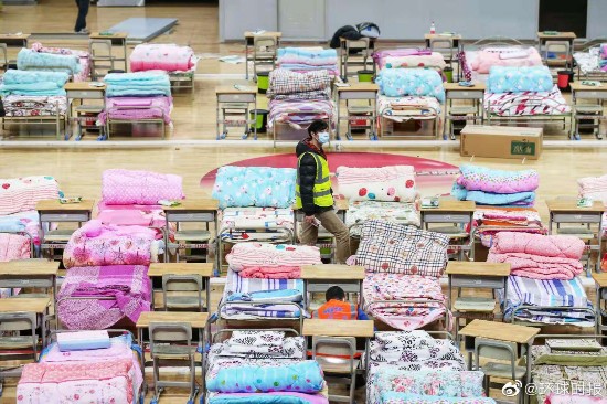 2月4日,湖北武汉洪山体育馆方舱医院进入施工布置的收尾阶段。从2月3日晚开始,武汉市连夜建了三所方舱医院,分别是洪山体育馆(800张床位)、武汉客厅(2000张床位)、武汉国际会展中心(1000张床位),专门收治确诊的轻症患者。