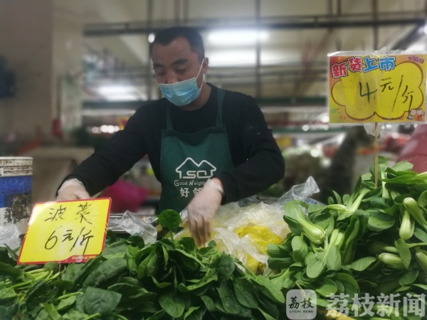 “现在太忙了……62块钱……葱就不收钱了,你买这么多菜……”2月3号下午,南京迈皋桥街道丁家庄农贸市场二楼蔬菜摊位,王勇一家三口正在紧张忙碌着。这两天,市民出一趟门总要买上好几天的菜,看到行动不便的老人前来,王勇总会打点折扣或随手抓把小葱塞进他的购物袋中。