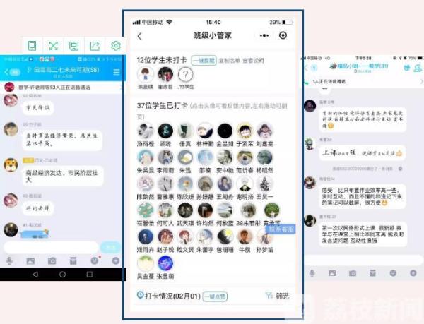 班主任李才学老师在本班的班级群里“偷听”了其他5位任课老师的课,直言“太充实了,就是眼睛受不了,流眼泪,但学了不少东西。”赵婕老师的感受是“要不停地提问”,以防止学生做其他事情。孙琳老师的建议是课后立刻抽查上课笔记,让学生拍照上传,以督查他们认真听讲。唐婉蓉老师趣言“大家都找到主播的感觉了”。匡海霞老师感觉“语文课在板书答案环节比真实课堂效果反而好,可以让多位同学同时呈现答案,然后大家一起分析评价修改。”张斌、仇燕、杜金龙等老师都觉得这种上课效果很好。