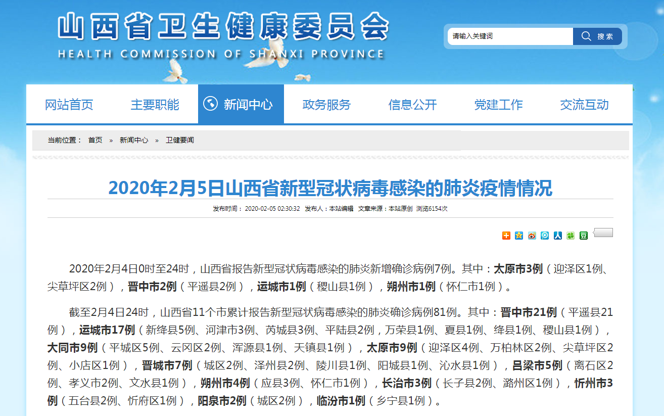 荔枝新闻讯 据山西省卫健委官网消息,2020年2月4日0时至24时,山西省报告新型冠状病毒感染的肺炎新增确诊病例7例。其中:太原市3例(迎泽区1例、尖草坪区2例),晋中市2例(平遥县2例),运城市1例(稷山县1例),朔州市1例(怀仁市1例)。